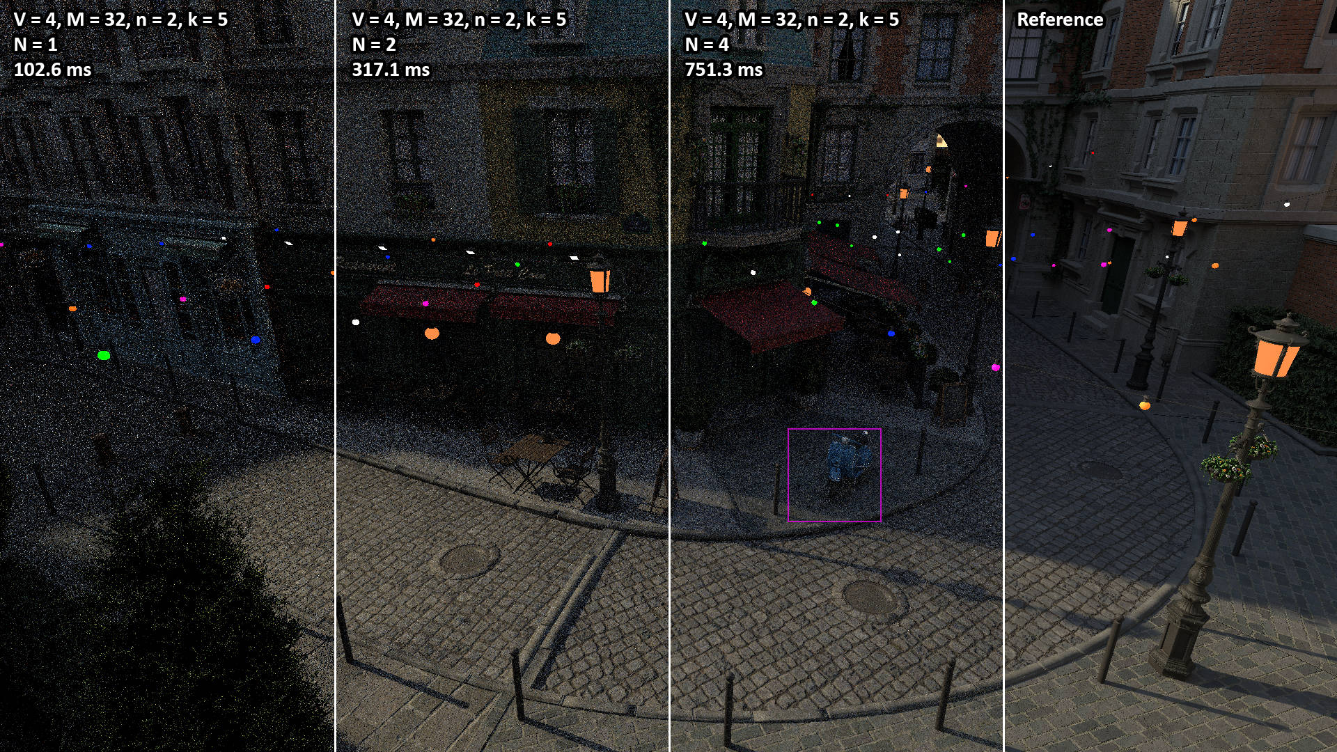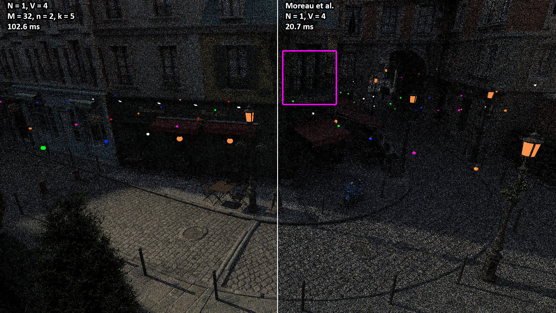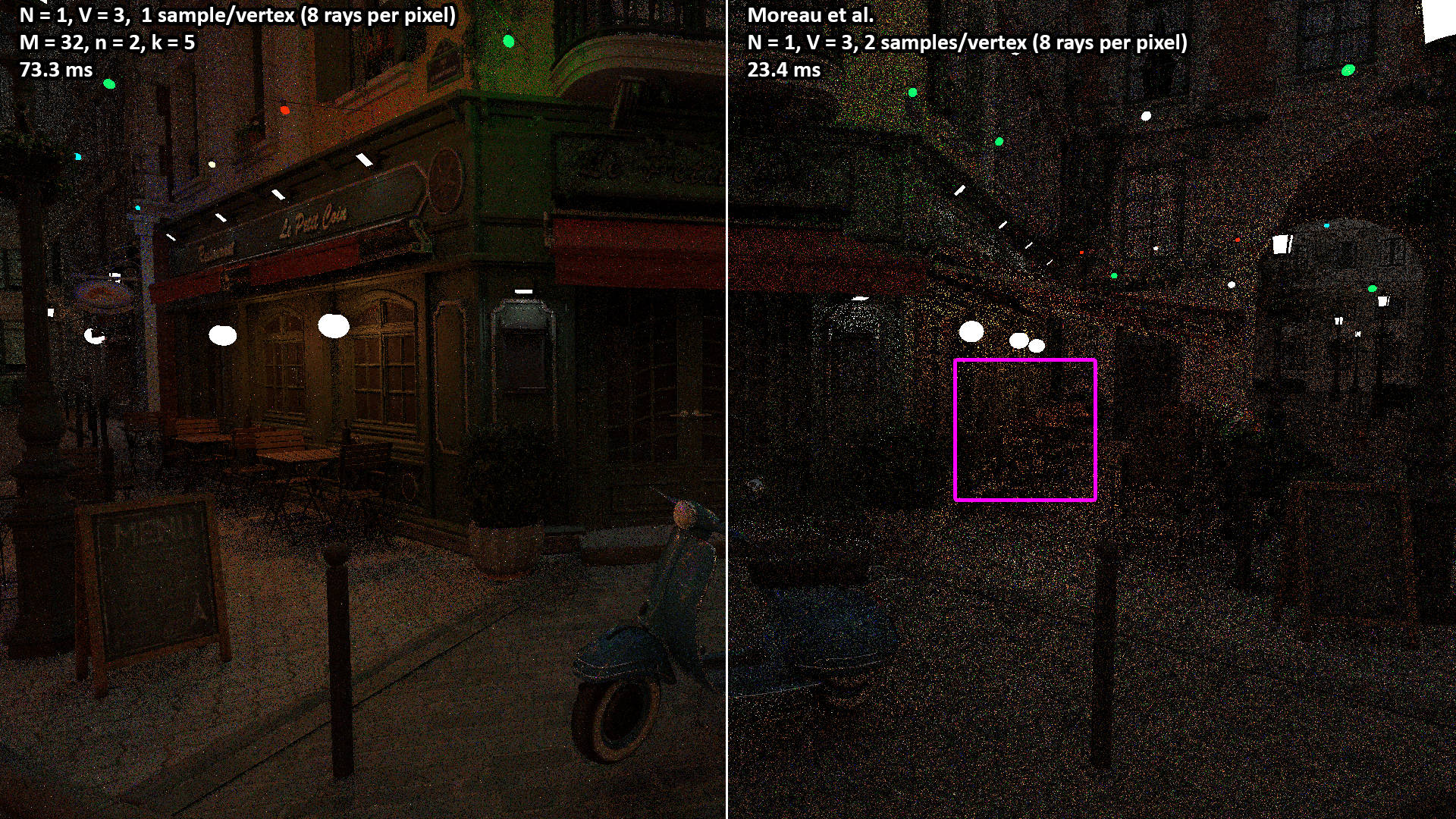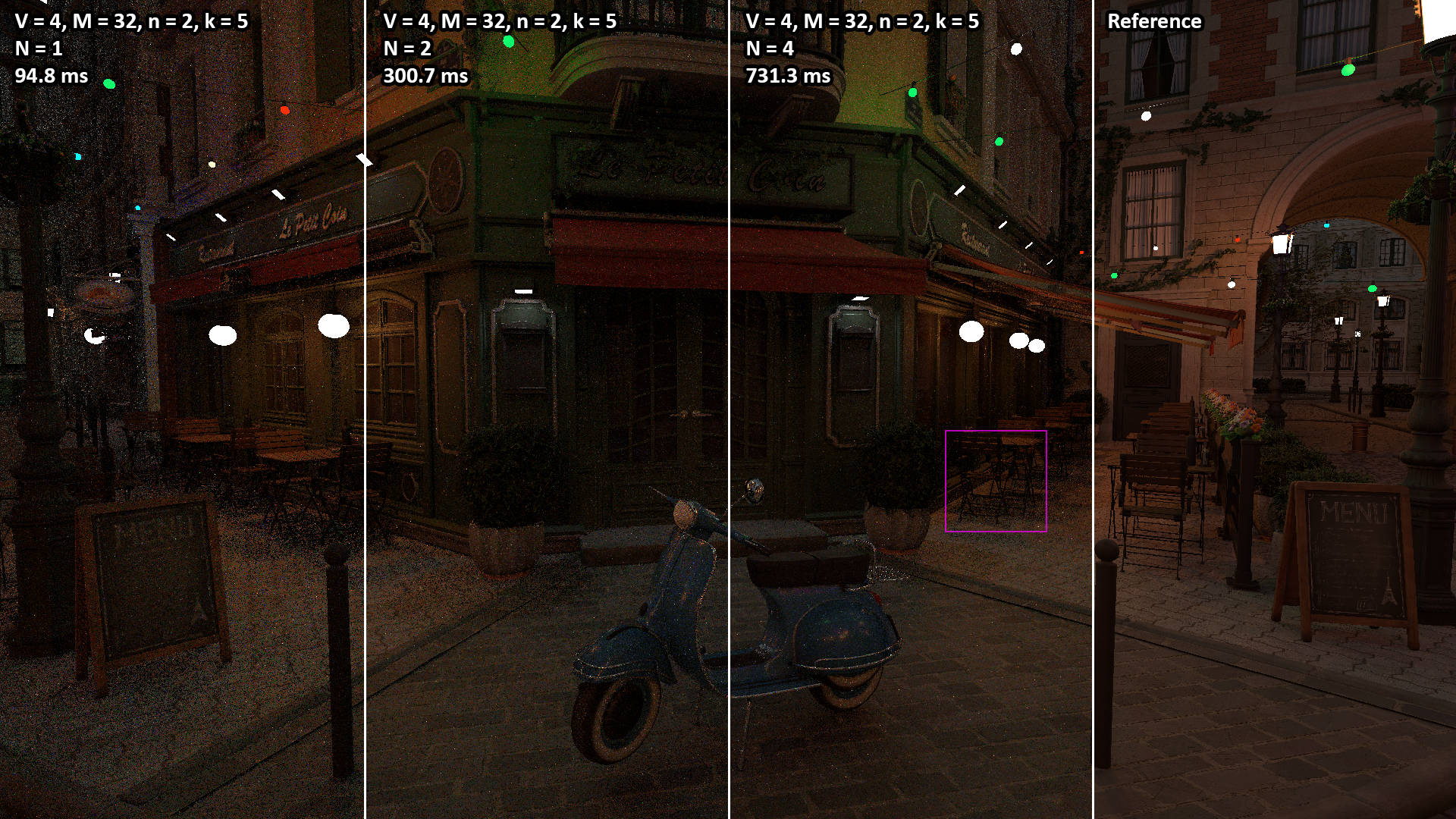 These videos show the 100 second camera path included with the Amazon Lumberyard Bistro scene. All videos were rendered with N = 1 light path samples of V = 3 vertices (i.e. two bounces) per pixel. The NEERSTIR algorithm uses M = 16 sample candidates drawn via RIS, temporal reuse, and n = 2 iterations of spatial reuse from k = 5 neighbors.