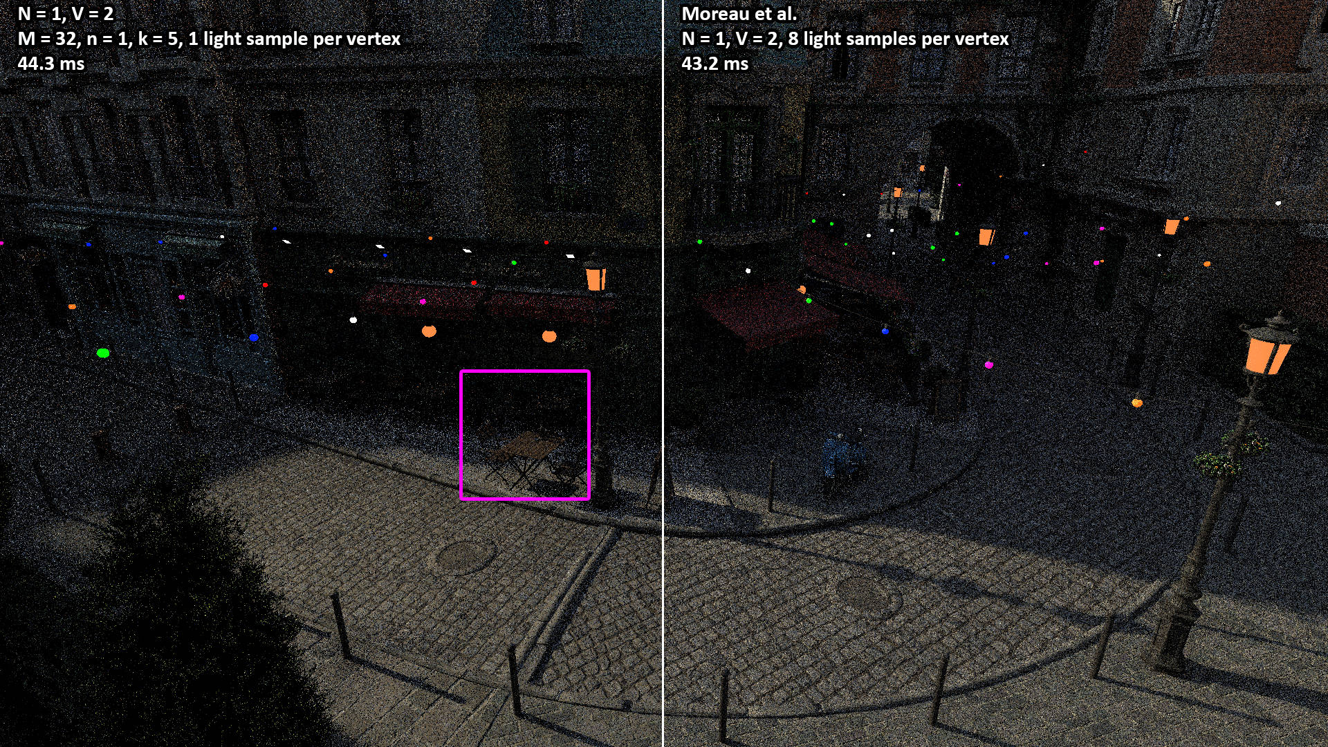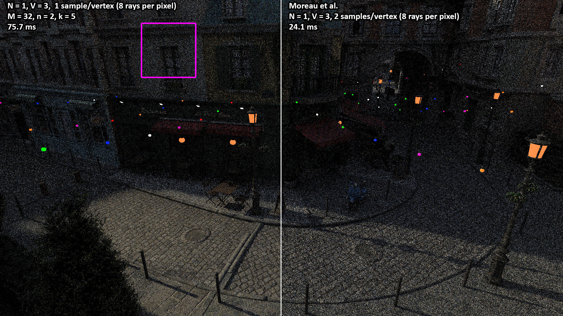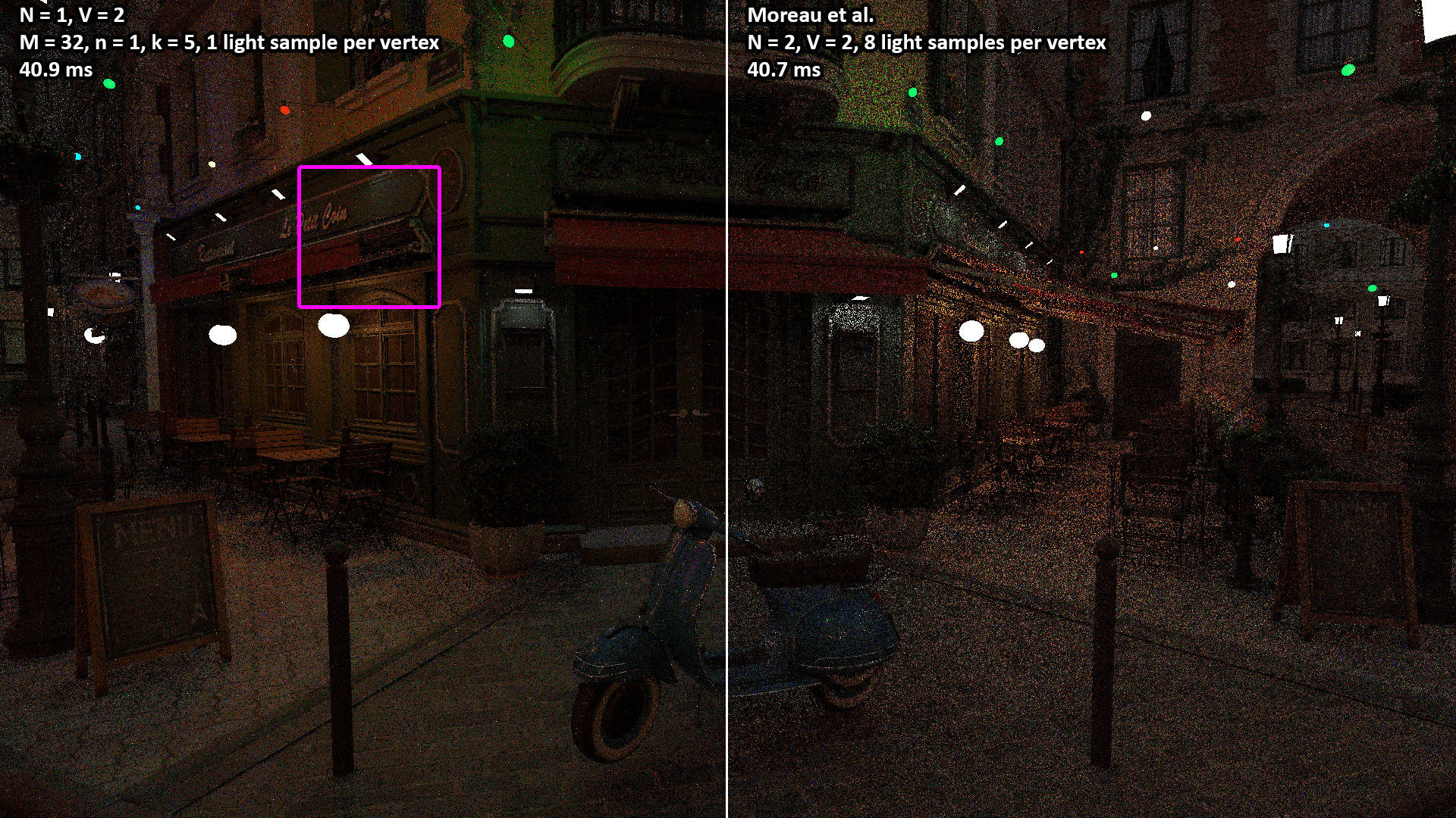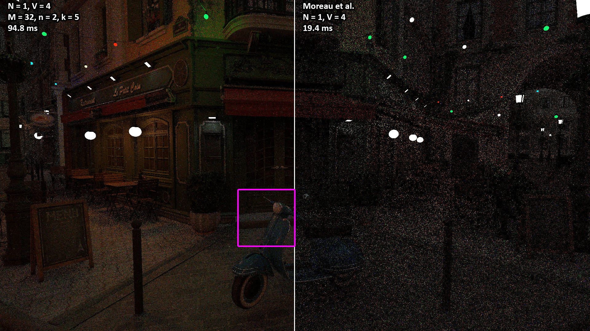 These videos show the 100 second camera path included with the Amazon Lumberyard Bistro scene. All videos were rendered with N = 1 light path samples of V = 3 vertices (i.e. two bounces) per pixel. The NEERSTIR algorithm uses M = 16 sample candidates drawn via RIS, temporal reuse, and n = 2 iterations of spatial reuse from k = 5 neighbors.