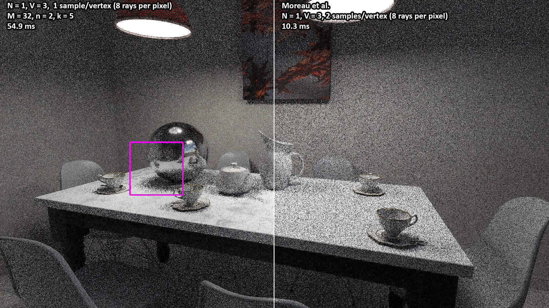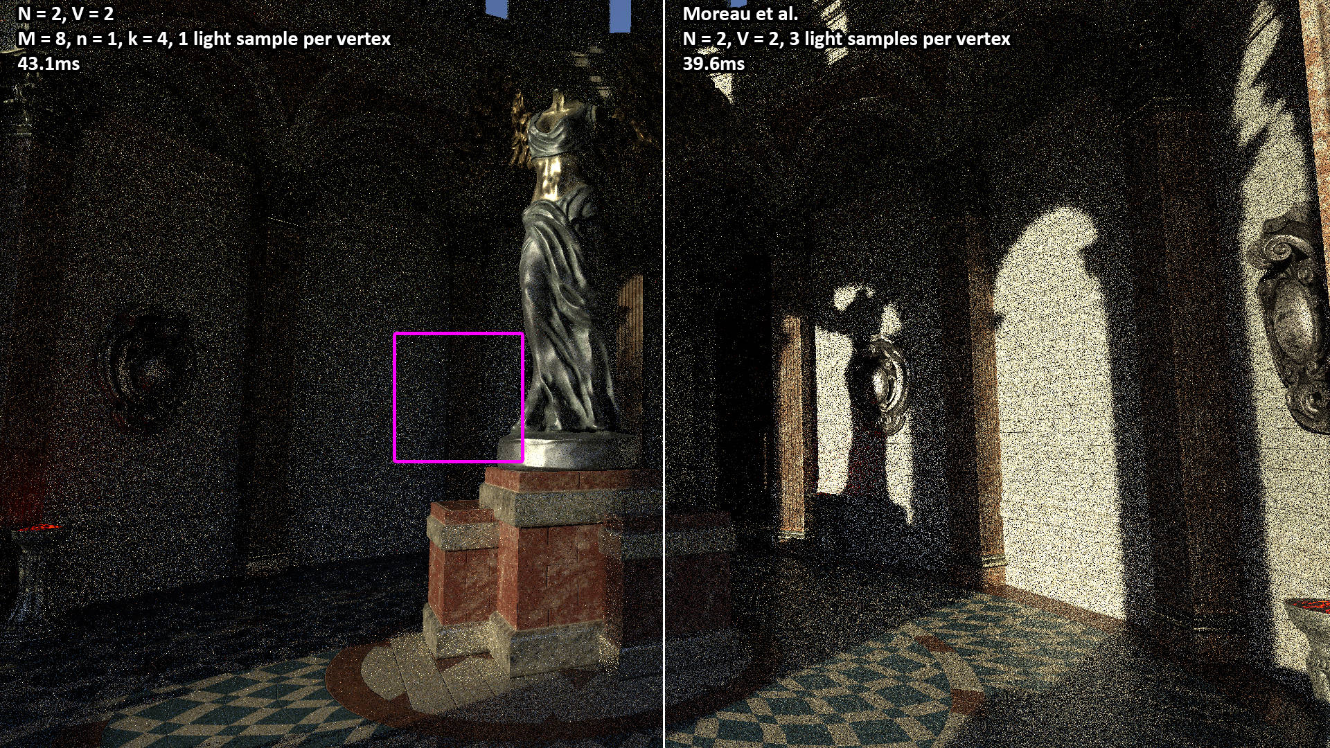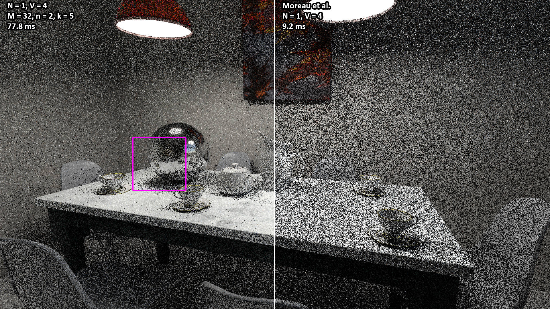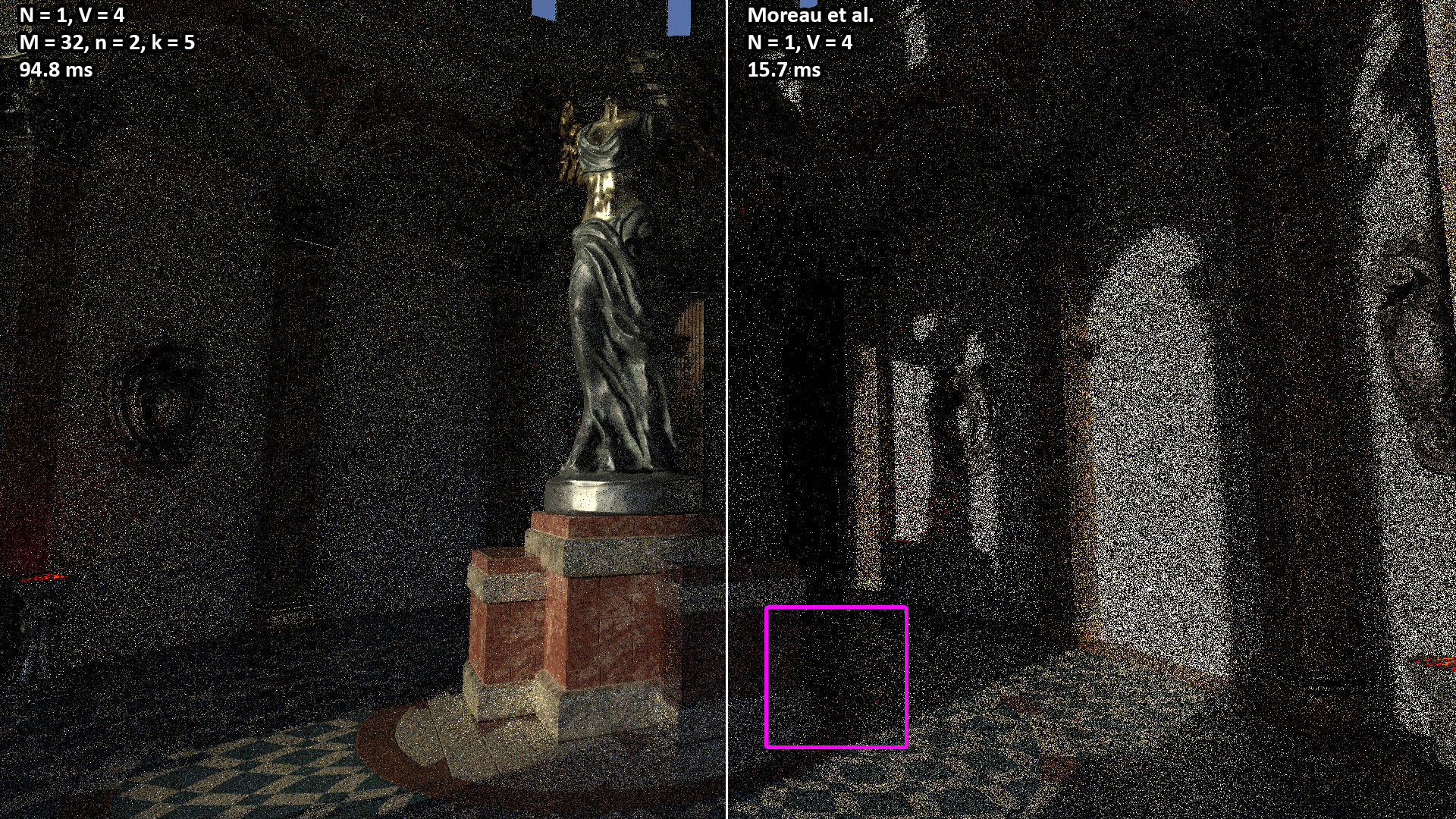 These videos show the 100 second camera path included with the Amazon Lumberyard Bistro scene. All videos were rendered with N = 1 light path samples of V = 3 vertices (i.e. two bounces) per pixel. The NEERSTIR algorithm uses M = 16 sample candidates drawn via RIS, temporal reuse, and n = 2 iterations of spatial reuse from k = 5 neighbors.