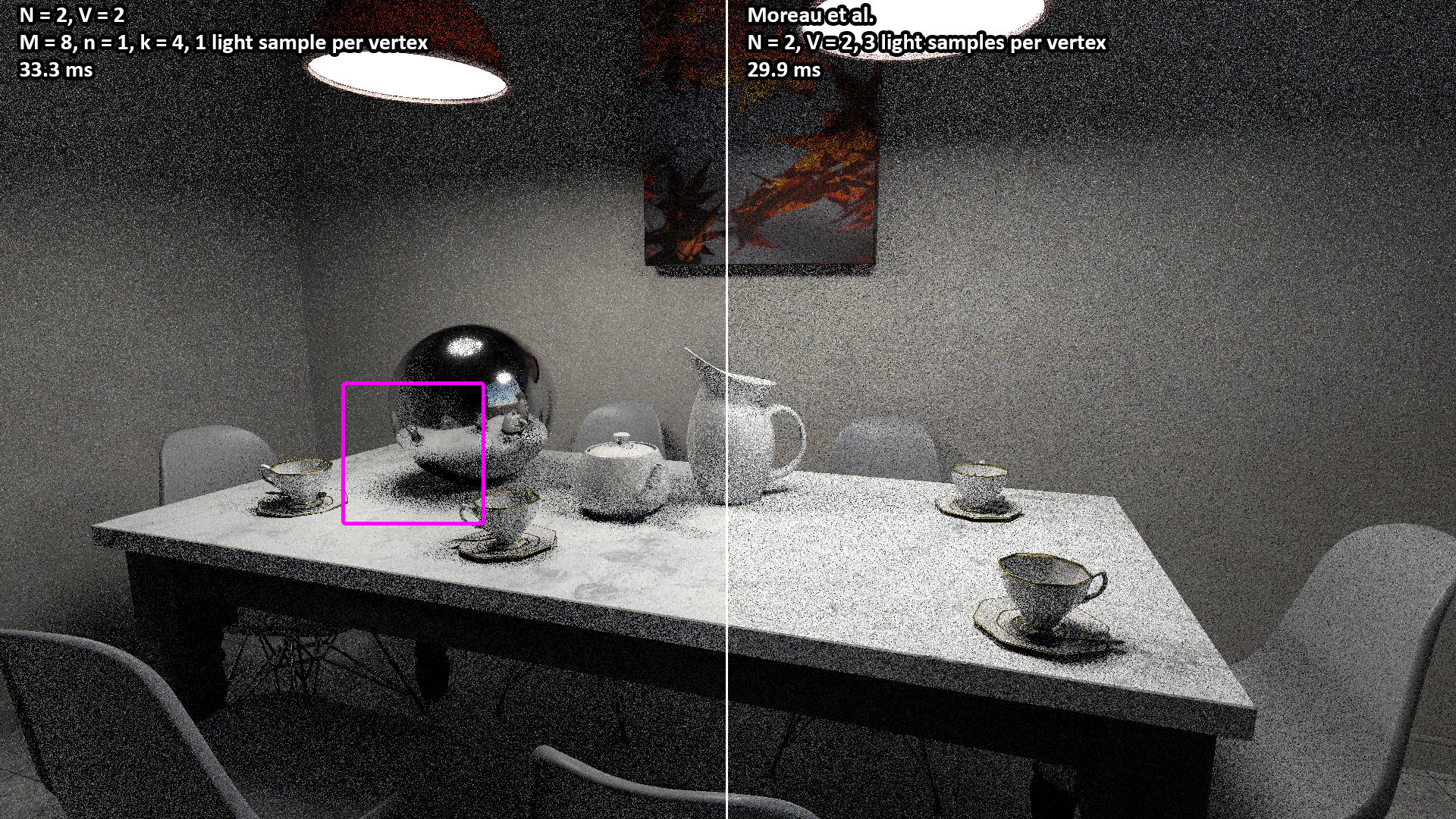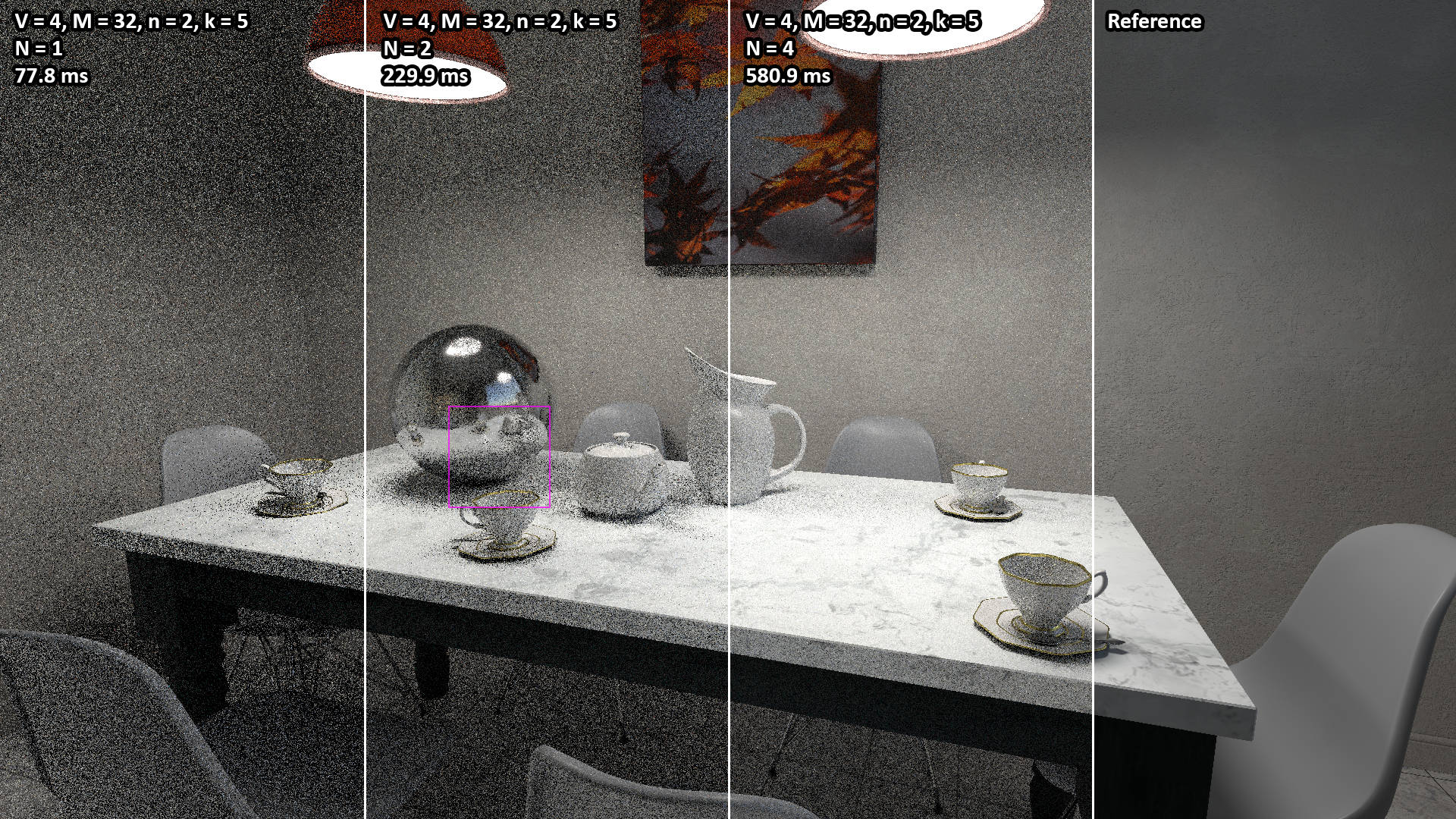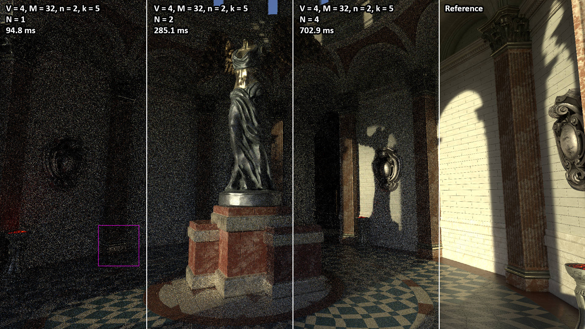 Due to the noisy nature of real-time ray-tracing, the compression used by online video sharing platforms severely compromises the quality of these videos. The original, uncompressed video assets are provided here but may be slow to load! Download links are provided below.
